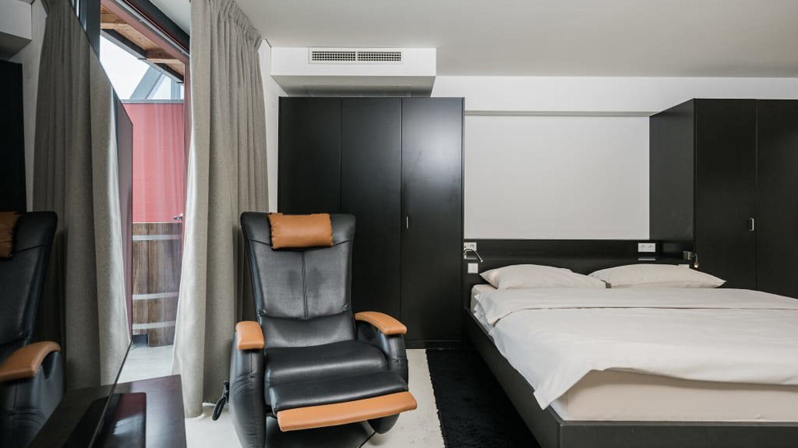 170 m² inkl. 100 m² Terrasse für 2 - 4 Personen, Luxus Suite im 5. Stock, geräumiger Wohn-Schlafraum, luxuriöse Couch, Sitzecke, Massagestuhl, abgetrenntes Kinderschlafzimmer mit Stockbetten, Marmorboden, Bad mit Dusche und Badewanne, separates-WC, Flat-TV, gratis W-Lan, Minibar, Safe, offener Kamin, Süd-Ost Terrasse von 40m² mit Panorama-Bio-& Finnische Sauna, Tauchbecken und Kuschelliege.