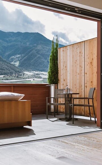 ca. 56 m² inkl. 16 m² Balkon für 2-3 Personen, kuscheliges, modernes Zimmer im 5. Stock, rollendes Bett mit Schlafmöglichkeit unter freiem Himmel, Holzboden, begehbarer Kleiderschrank, Sofa, Sitzecke, Bad mit Badewanne, Dusche, WC, Bidet, Flat-TV, gratis W-Lan, Minibar, Safe, Südbalkon, Garage