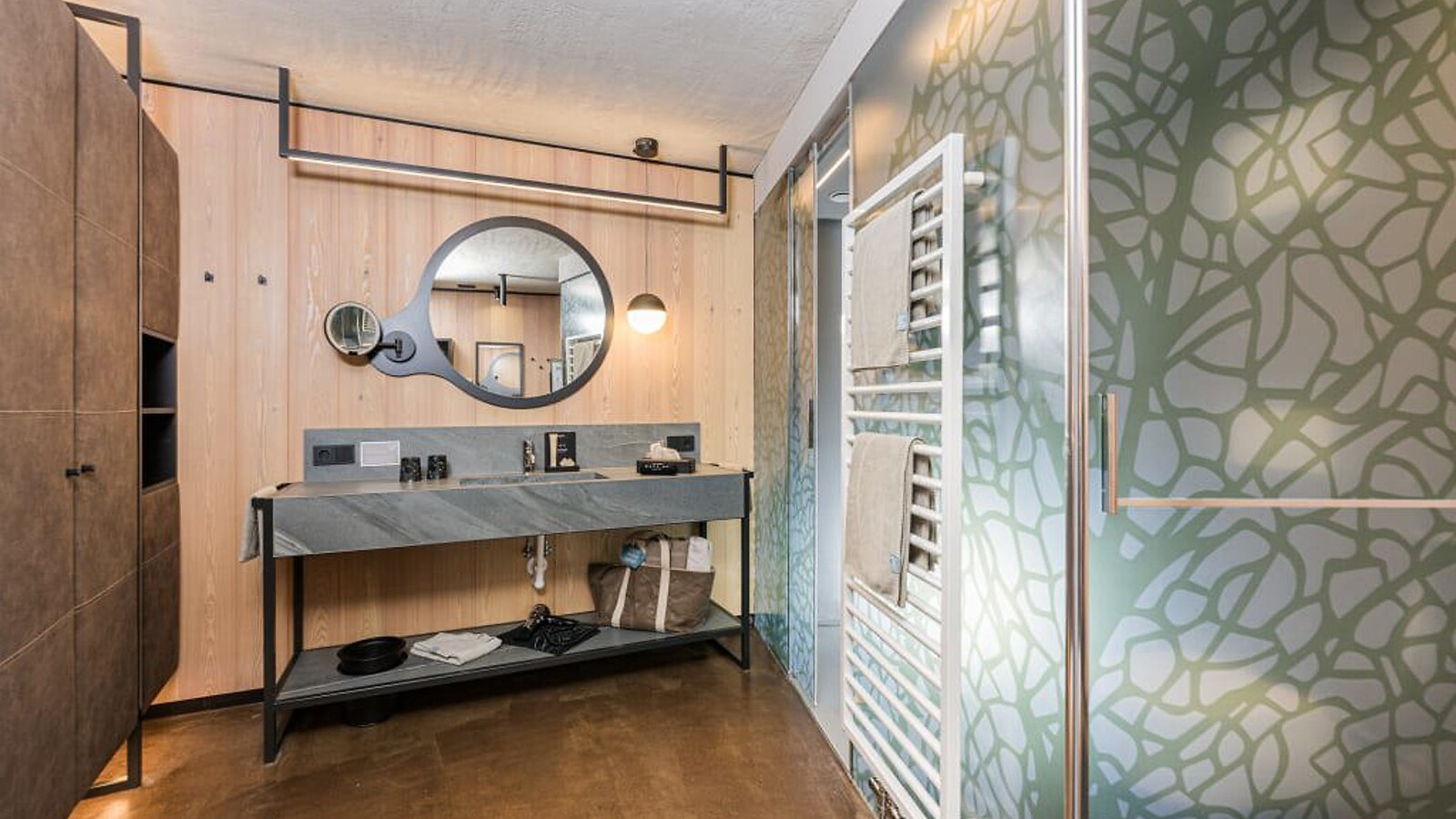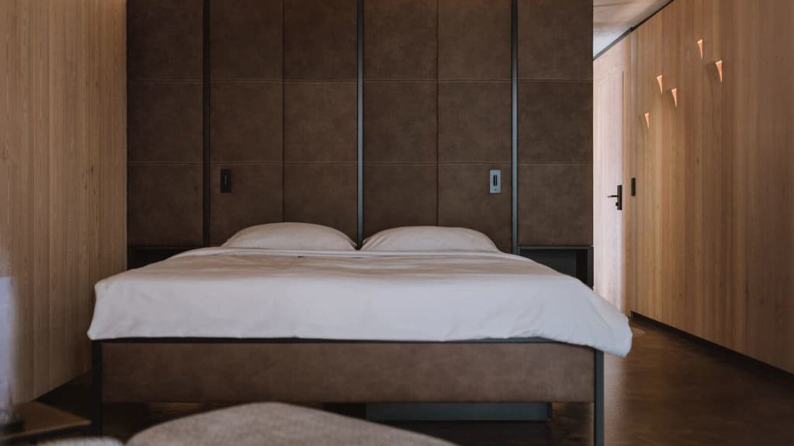 ca. 46 m² inkl. 11 m² Balkon für 2 Personen im Neubau, kuscheliges, modernes Zimmer, Einrichtungen aus Naturmaterialien, Naturestrichboden in Erdfarben, gebürstetes Vollholz in heimischer Lärche, grober Spritzputz an der Decke für angenehme Raumakustik, Schrank und Bett aus Leder, Schreibtisch aus Leder, Stehlampe mit 2 Designer Lounge Sessel und Beistelltisch, Flat TV, offenes Bad mit Waschbecken, Dusche, WC mit Brause, kostenlos W-Lan, Minibar, Safe und Garage - keine Haustiere erlaubt