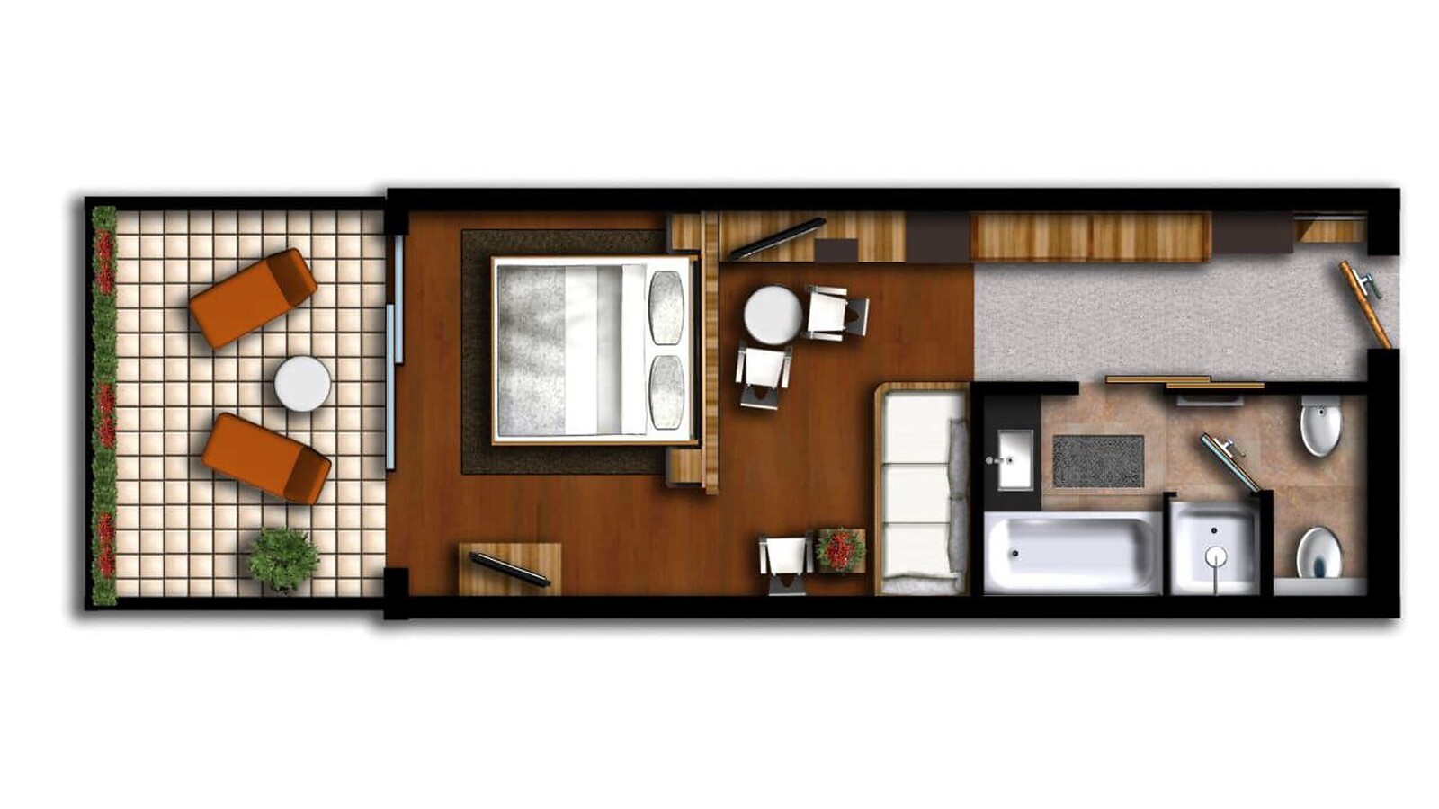 ca. 43 m² inkl. 10 m² Balkon für 2-3 Personen, kuscheliges, modernes Zimmer, rollendes Bett mit Schlafmöglichkeit unter freiem Himmel, Holzboden im Schlafbereich, Kuschelteppich im Eingangsbereich, Bad mit Badewanne, Dusche, Bidet, Flat-TV, gratis W-Lan, Minibar, Safe, Südbalkon, Garage - keine Haustiere erlaubt