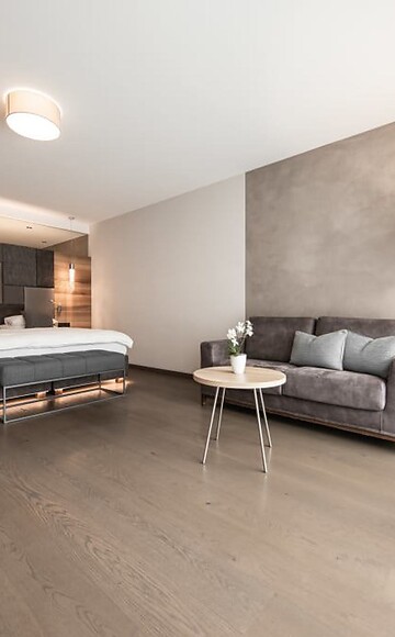 ca. 60 m² mit 12-15 m² Pergola-Balkon zur Südseite mit atemberaubender Aussicht auf den Alpiana Poolgarten und in die grüne Weite, im einzigartigen ALPIANA Design mit Eichenholz-Fußboden, großes Luxus-Bad mit Dusche und getrenntem WC, im 3. Stockwerk, Flat-TV, Safe, Mini-Bar mit Südtirol-Produkten, übergroßes Luxus-Bett, mit Klimaanlage, großzügiger Pergola Balkon mit Outdoor-Möbeln, Garagenplatz inklusive
