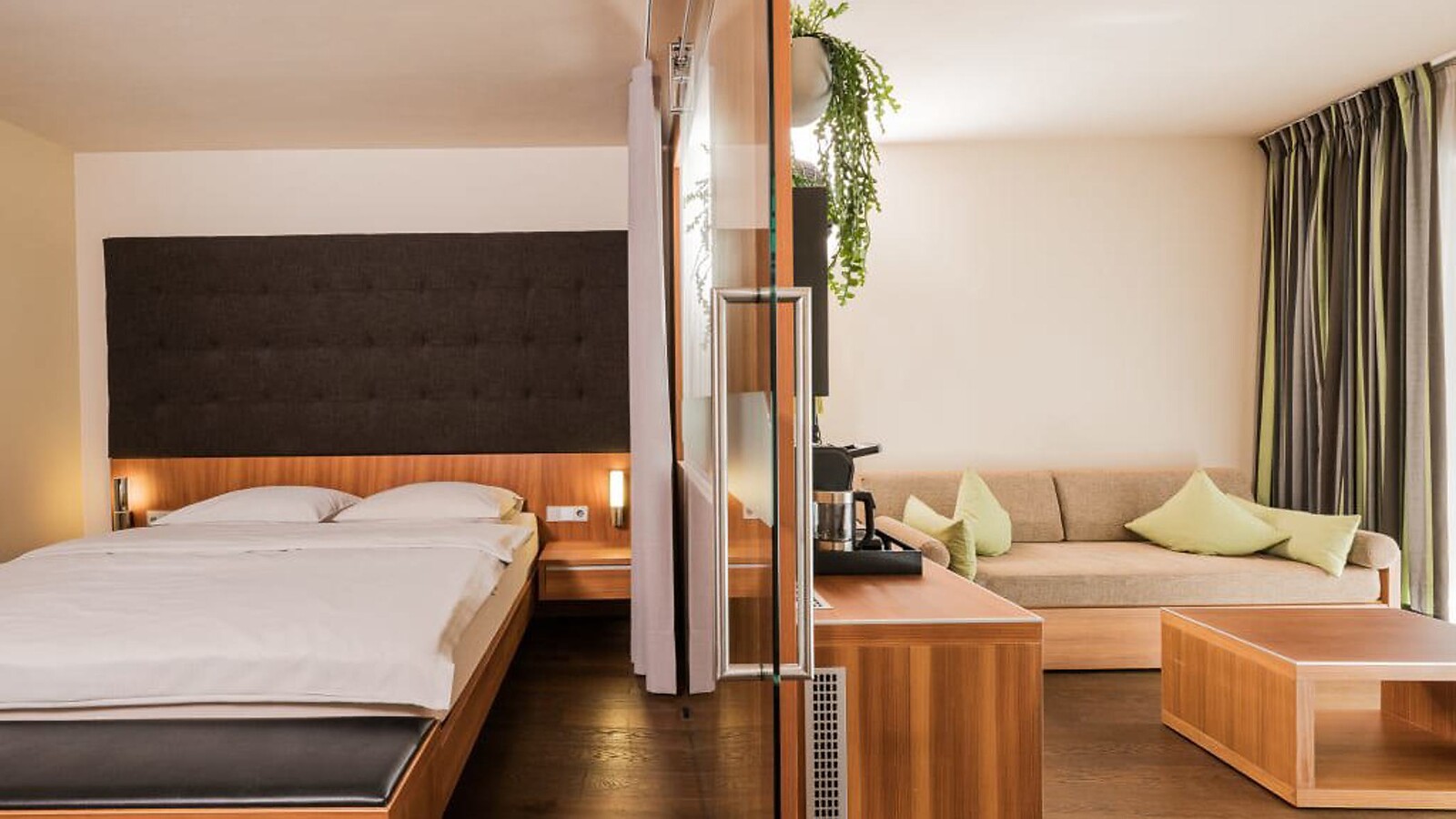 ca. 59 m² inkl. 11 m² Balkon für 2 - 4 Personen, Suite im 2. Stock, Wohn- & Schlafraum durch Tür abtrennbar, Sofa und Sitzecke, modern und in warmen Farben eingerichtet, Holzboden, Bad mit Badewanne und Dusche, Bidet, separates WC, Flat-TV, gratis W-Lan, Minibar, Safe, Balkon zur Südseite, Garage