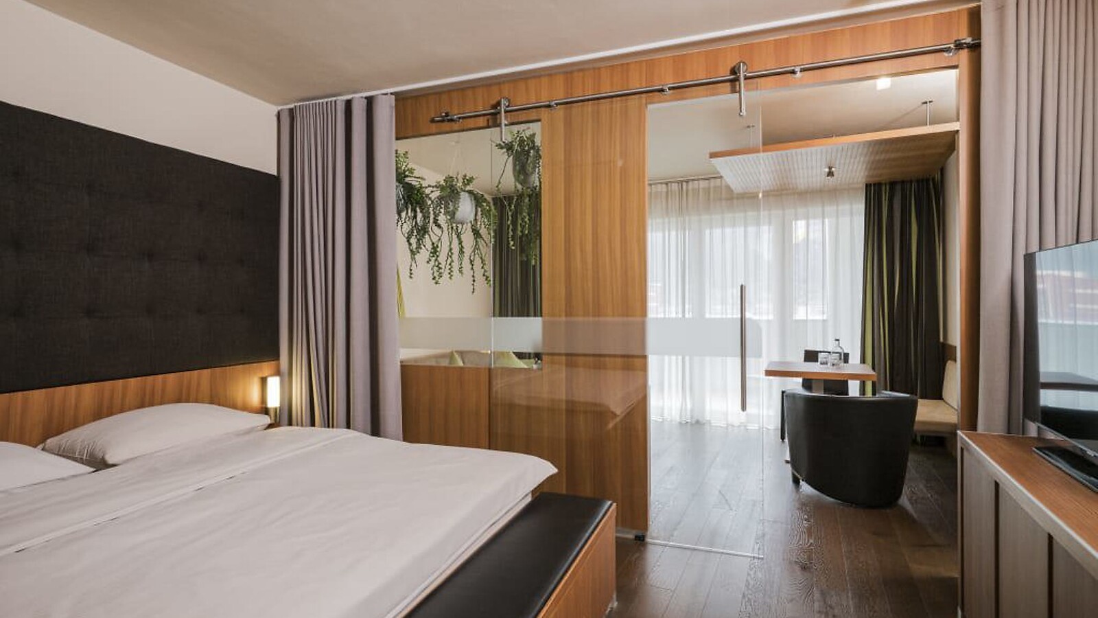 ca. 58m² inkl. 10 m² Loggia für 2 - 4 Personen, Suite, Wohn- und Schlafraum durch Schiebetür abtrennbar, Sofa und Sitzecke, modern und in warmen Farben eingerichtet, Holzboden, Bad mit Badewanne, Dusche, Bidet, separates WC, Flat-TV, gratis W-Lan, Minibar, Safe, Loggia zur Südseite, Garage.