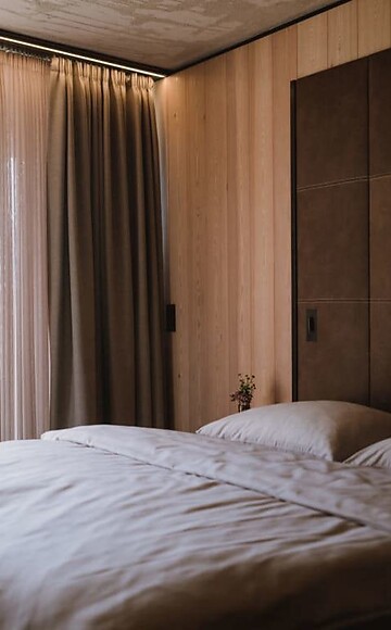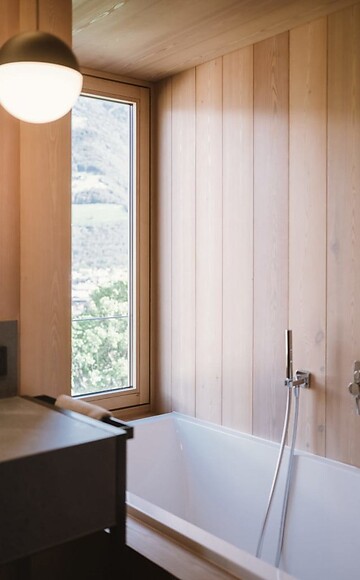 ca. 61 m² inkl. 15 m² Balkon für 2 – 4 Personen im Neubau, kuschelige, moderne Suite, getrennter Wohn-Schlafbereich, Einrichtungen aus Naturmaterialien, Naturestrichboden in Erdfarben, gebürstetes Vollholz in heimischer Lärche, grober Spritzputz an der Decke für angenehme Raumakustik, Schrank und Bett aus Leder, Schlafcouch (französisches Maß), Schreibtisch aus Leder, Stehlampe mit Designer Lounge Sessel, Bad mit Doppel- Waschbecken, Dusche, Badewanne mit Sicht in die Natur, WC mit Bidet, Flat TV, kostenlos W-Lan, Minibar, Safe, Garage - Haustiere nicht erlaubt