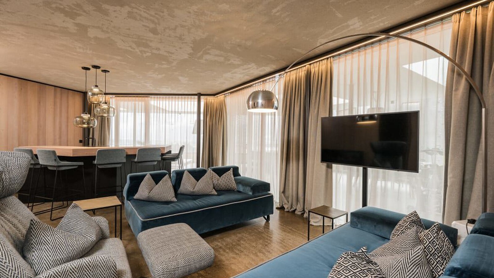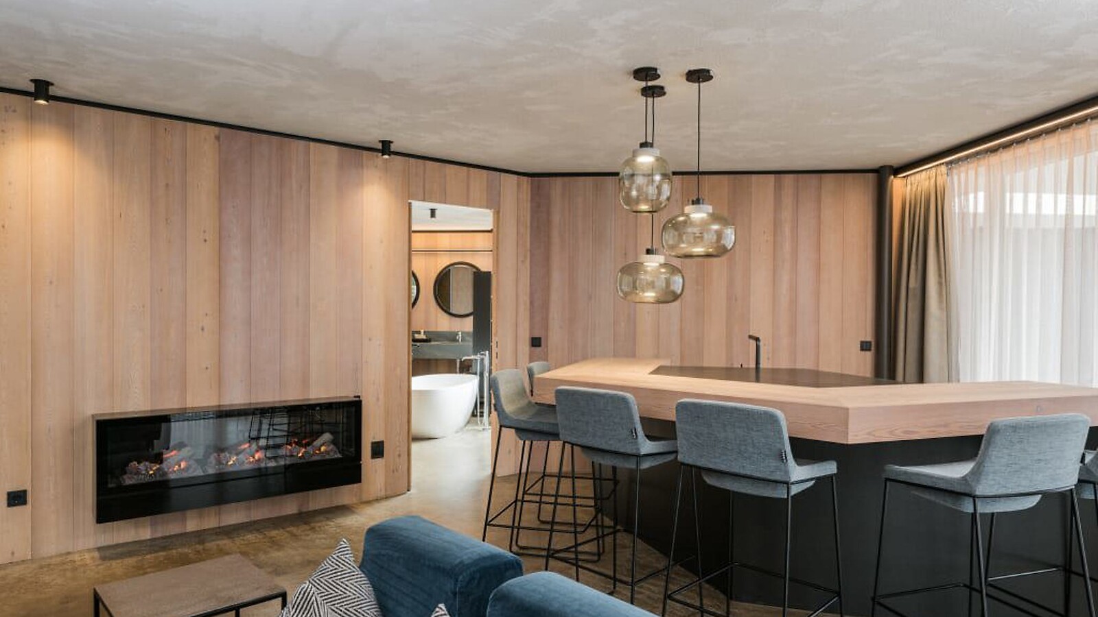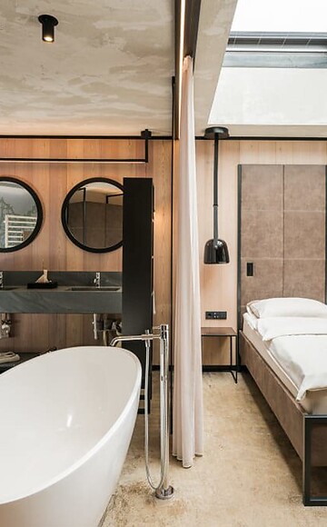 ca. 176 m² inkl. 81 m² Terrasse für 4 – 6 Personen im Neubau, kuschelige, moderne Luxus Familien Suite, mit 2 Schlafeinheiten und einer abgetrennten Wohneinheit, Einrichtungen aus Naturmaterialien, Naturestrichboden in Erdfarben, gebürstetes Vollholz in heimischer Lärche, grober Spritzputz an der Decke für angenehme Raumakustik, Schrank und Bett aus Leder mit Himmelblick durch Skydach, Schreibtisch aus Leder, Stehlampe mit Schlafcouch (französisches Maß) und Designer Lounge Sessel mit Beistelltisch, Kitchenette (Teekocher, Kaffeebar, Kochfeld, Cocktailbar, großer Esstisch), Feuerstelle, Flat TV, eigenes Kino, 2 getrennte Badeinheiten mit freistehender Designer Badewanne, Bad mit Doppel-Waschbecken, Dusche, WC mit Bidet, kostenlos W-Lan, Minibar, Safe und Garage - Haustiere nicht erlaubt