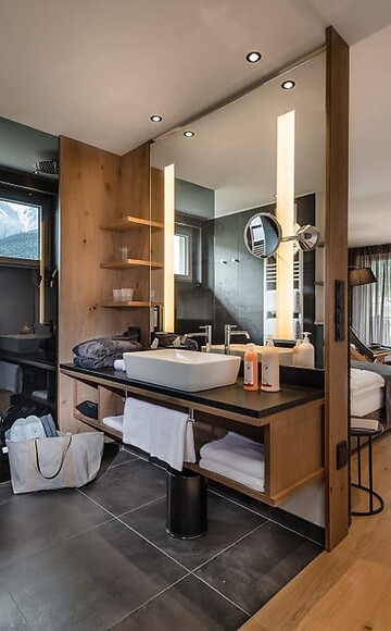 Die Suite mit einem gewissen Etwas. Moderne Suite in der 4. Etage. Offenes Badezimmer und abgetrenntes WC, Tageslicht in allen Räumen, geräumiger Wohn- und Schlafbereich und supergemütliche Infrarot-Liegen anstelle einer Couch. Ideal für alle, die sich nach dem Sport so richtig entspannen und die Muskulatur lockern wollen.