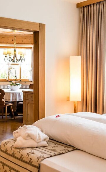 Eine Suite für echte Alpen-Liebhaber. Geräumige Suite im alpin-rustikalen Stil mit abgetrennten Wohn- und Schlafbereich. Das Highlight? Eine über 40 Jahre alte Zirben-Stube mit Erker, Sitzecke und Couch. Großer Balkon mit Poolblick und Nachmittagssonne.