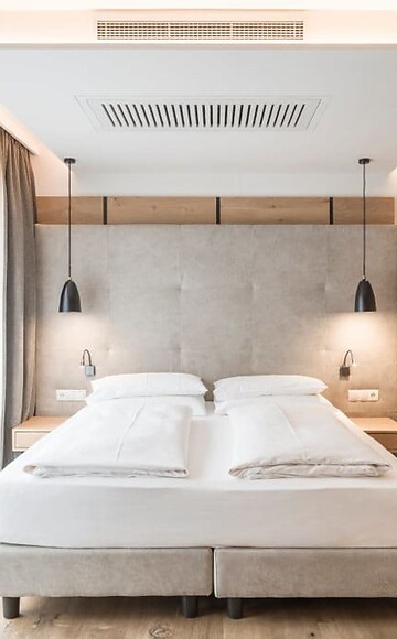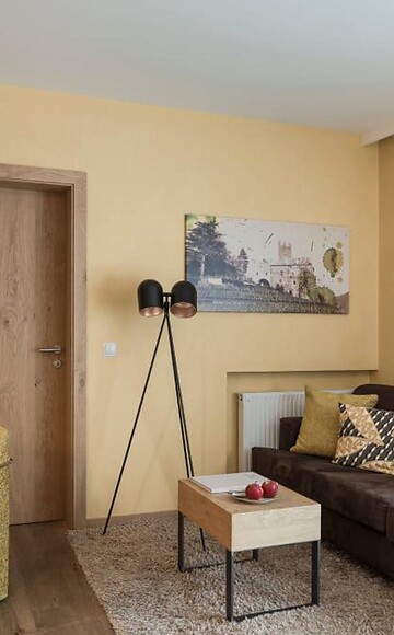 Helle und freundliche Suite mit exklusiv ausgestattetem Wohnraum mit gemütlicher Sitzecke, Holzboden, Naturholzmöbeln, separatem Kinderzimmer mit zwei getrennten Betten, modernem Badezimmer mit großer Walk-In-Dusche, Doppelbadewanne, Doppelwaschbecken, separatem WC, Minibar, Safe, 2 Flatscreen TV, Telefon, kostenlosem WLAN, Nordbalkon, Garagenplatz und Klimaanlage.