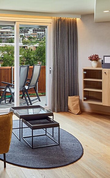 More space for more wellbeing. With an exclusive appointed living room with comfortable seating corner, wooden floor, natural wood furniture, separate children's room with two single beds, modern bathroom with large walk-in shower, double basin, separate toilet, minibar, safe, 3 flat screen TV, telephone, free WiFi, north-facing balcony, a garage parking space and air conditioning.