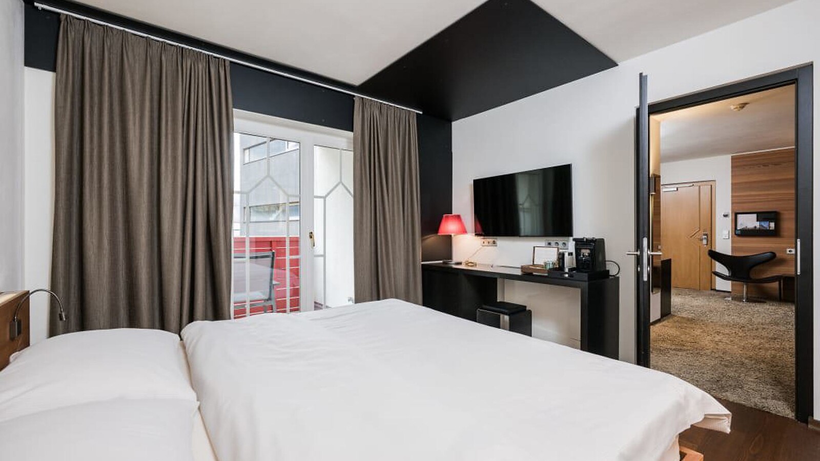 approx. 44 m² incl. 8 m² balcony for 2 - 3 people, cosy, modern room, separate living room and bedroom, couch, wood flooring in the bedroom, comfy carpet in the living room, 2 small balconies with views of Merano and environs, bathroom with bathtub, shower, bidet, separate toilet, flat-screen TV, free Wi-Fi, minibar, safe, parking space in the garage – pets not allowed