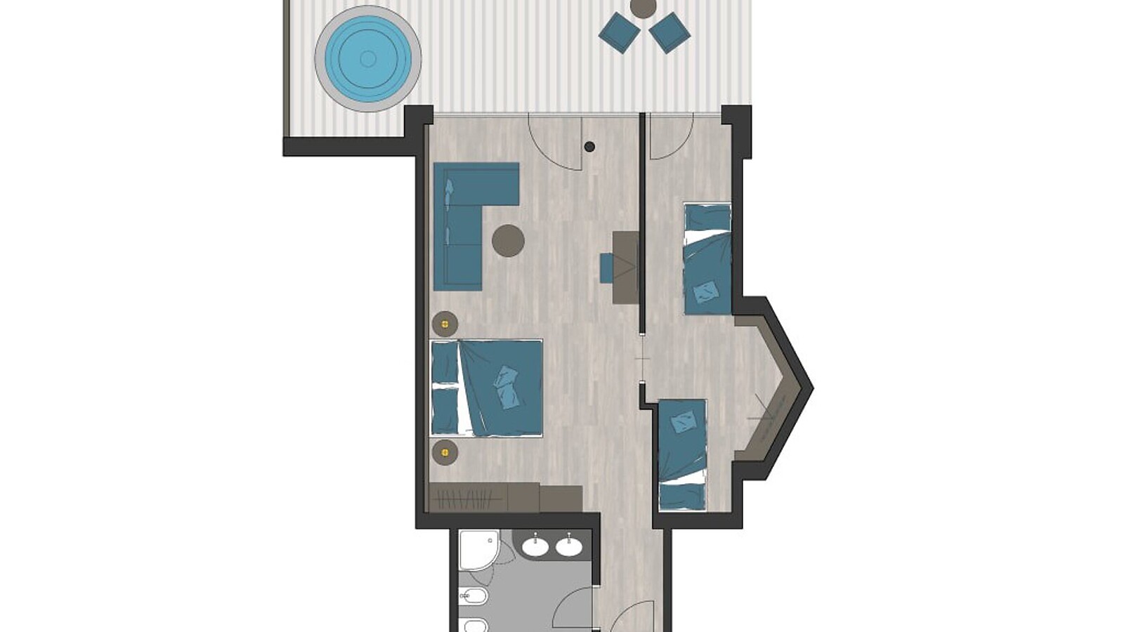 53 m² - Luxurious suite with double room and separate twin bed room, wooden floor and balcony with the morning sun and a private whirlpool (NEW). Bathroom with bath tub and shower, WC, double wash basin, bidet, make-up mirror and hairdryer. Safe, satellite TV, WIFI and minibar