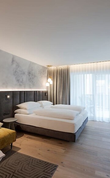 Friendly and generous. Our La Vita double room features a comfortable seating corner, wooden floor, natural wood furniture, modern bathroom with large walk-in shower, double basin, separate toilet, minibar, safe, flat screen TV, telephone, free WiFi, west-facing balcony with relax lounger, a parking space in front of the hotel and air conditioning.
