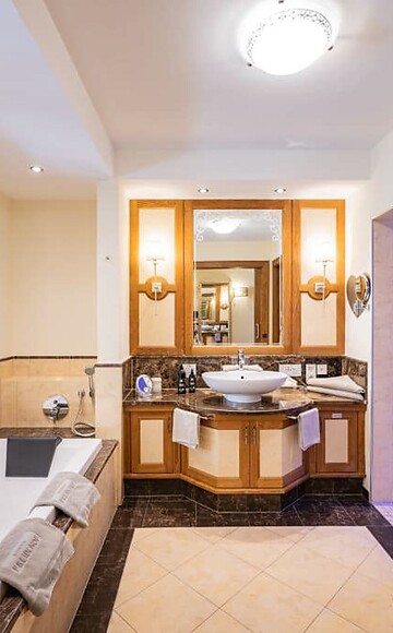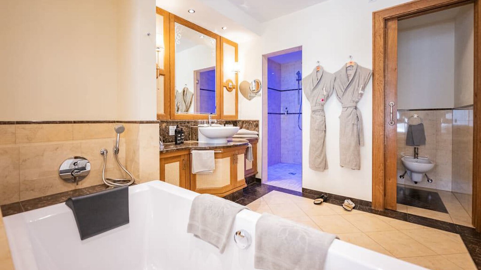 59m² including 17m² southern-facing setting with small wooden jetty on the biotope, classic, elegant natural wood furnishings, luxury box-spring bed with "Sleep-Fit Health-System" 210 cm, comfort cabinet system, writing and work table, Dolby-Surround TV with DVD player, small bar with wine, Nespresso & tea desk, spacious luxury bathroom with relaxing shower for two, romantic bath, noble washbasin, separate toilet and bidet, outdoor living room - loggia in a private ambience, southern-facing setting with views overlooking the mountain landscape of South Tyrol, with small wooden jetty on the biotope and comfortable relaxation furnishings, no animals. In our Sonnenschlössl.