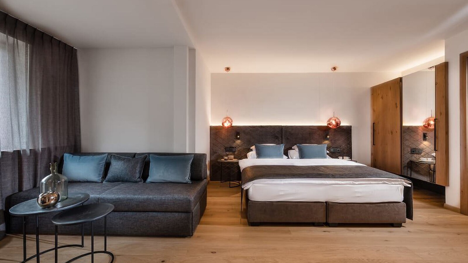 43-45 m² - Suite in part with separate sleeping and living area. Wooden floor and balcony with the morning or afternoon sun. Bathroom with shower and bath tub, in part double wash basin, WC, make-up mirror, hairdryer. Safe, satellite TV, WIFI and minibar