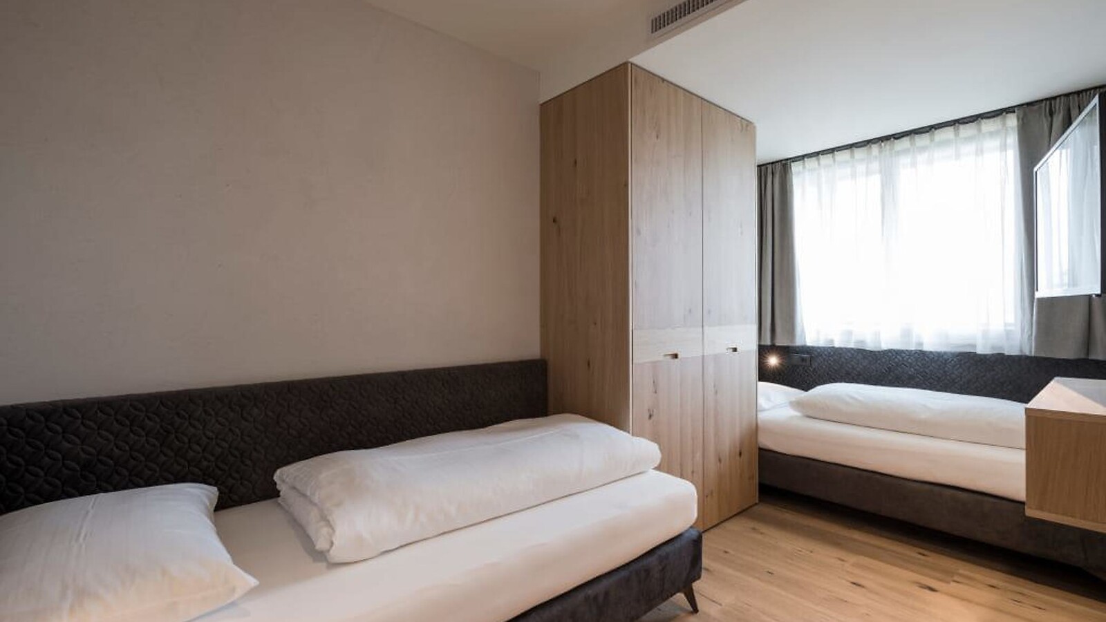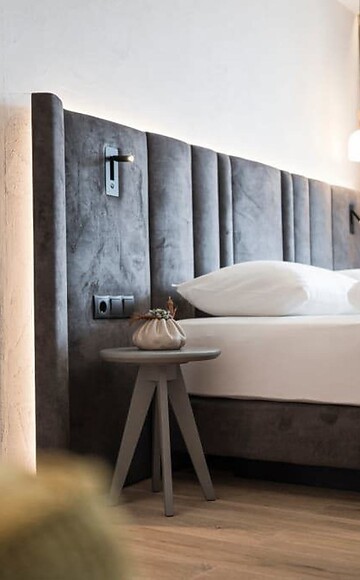 Flooded with light and in the middle of green. Our Nature Suite with an exclusive appointed living room with large, cosy seating corner, wooden floor, natural wood furniture, separate children’s room with two single beds, modern bathroom with large walk-in shower, double basin, separate toilet, minibar, safe, 2 flat screen TV, telephone, free WiFi, east-facing panoramic terrace with relax lounger, a garage parking space and air conditioning.
