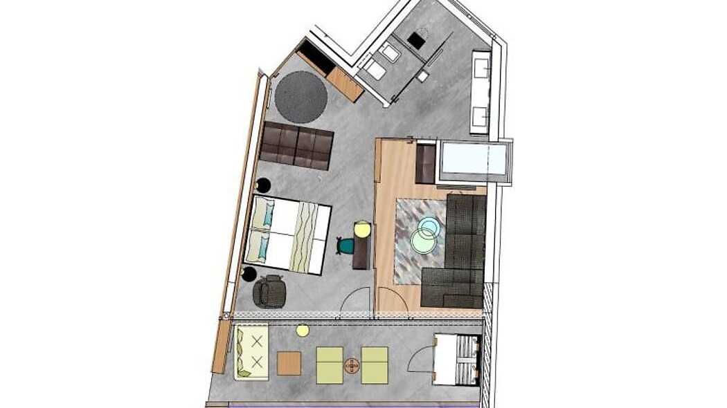 approx. 61 m² incl. 15 m² balcony for 2 - 4 people in the new building, cosy, modern suite, separate living room and bedroom, furnishings made of natural materials, natural cement flooring in earth tones, brushed solid local larch wood, rough plaster on the ceiling for pleasant room acoustics, wardrobe and bed made of leather, sofa bed (French size), leather desk, floor lamp withdesigner lounge armchairs, bathroom with double sink, shower, bathtub with views of the surrounding countryside, toilet and bidet, flat-screen TV, free Wi-Fi, minibar, safe, garage - pets not allowed