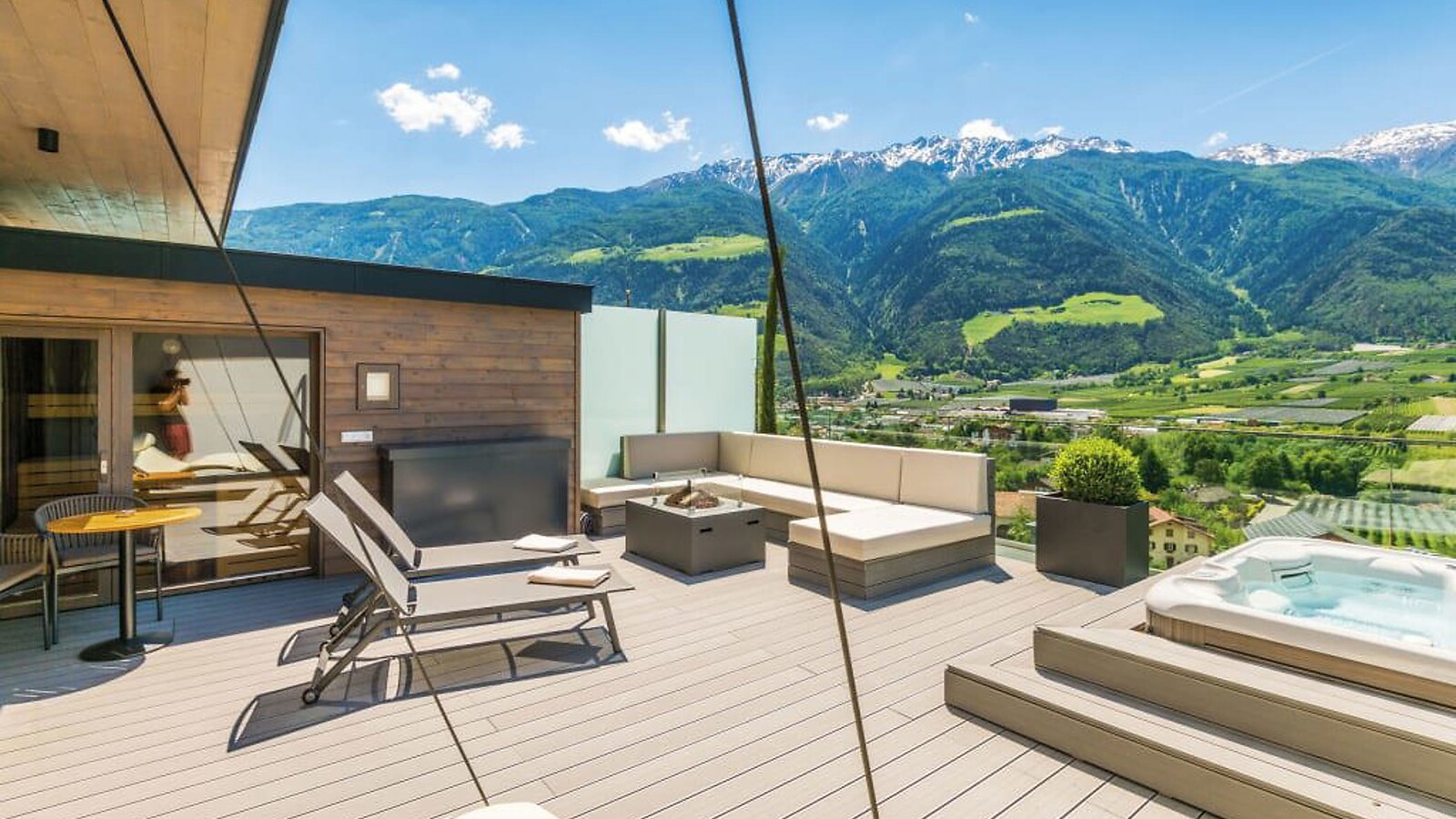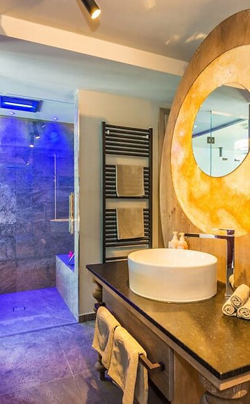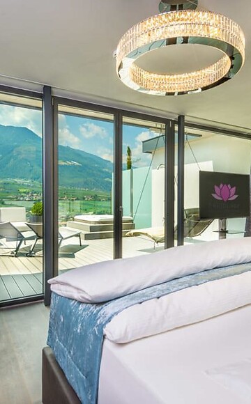 101m² including 56m² outdoor penthouse terrace with whirlpool, private butler service, open-plan living/sleeping lounge with romantic fire, luxury box-spring beds with "Sleep-Fit-Health-System", comfort-professional cabinet area, 2 relaxing designer chairs, Dolby-Surround TV with Bluetooth, suitcase-style bar with wine, Nespresso & tea desk, bathing lounge with designer mirror made of semi-precious stone with lady's beauty desk, multi-sensory shower for two with light & sound system, outdoor penthouse terrace and garden in a private setting, whirlpool de luxe with hygienic-luxury-system, Finnish exterior sauna with multi-sensory shower for two & swing couch for two, "Sky Star" fireplace with cosy lounge, outdoor cinema, comfortable seating and dining furnishings, aromatic herbs, radiant warmers and lantern, no animals. In our DolceVita Lodge.
