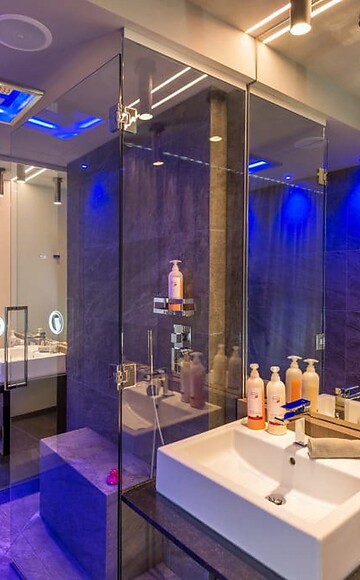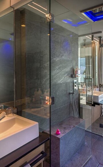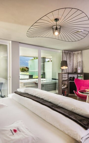 63m² including 21m² outdoor living room (loggia) with whirlpool, luxury box-spring bed with "Sleep-Fit-Health-System" 210 cm long, comfort professional cabinet system, 2 romantically designed chairs, romantic fire, Dolby-Surround-TV with Bluetooth, suitcase-style bar with wine, Nespresso & tea desk, designer bathroom with multi-sensory shower for two with light & sound system, lady's beauty desk, separate washbasin for him & her, separate toilet, outdoor living room in a private setting & day bed for two, whirlpool de luxe with hygienic-luxury-system, comfortable seating, aromatic herbs, radiant warmers, no animals. In our DolceVita Lodge.