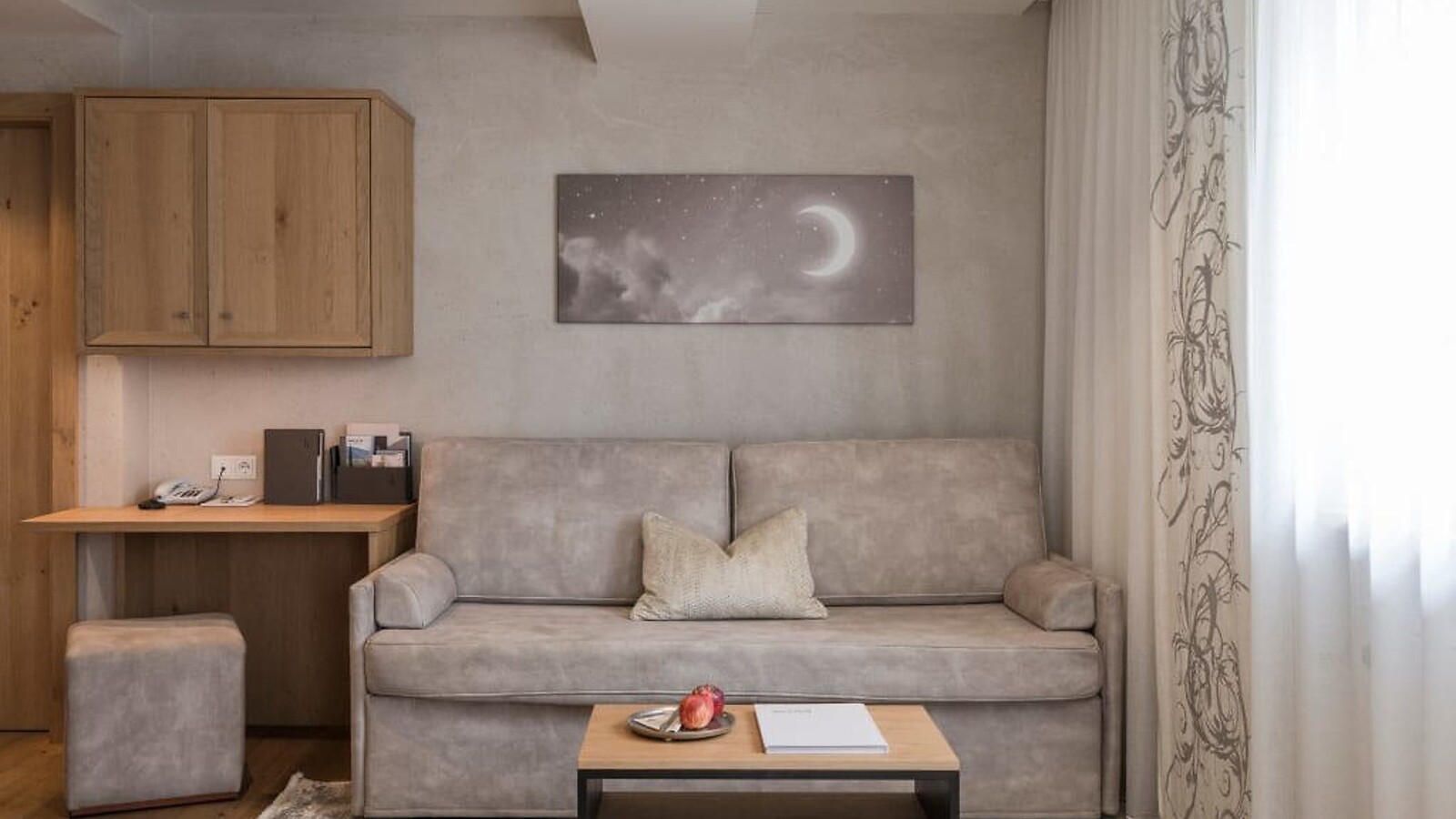 More space for cosiness and well-being. With a comfortable seating corner, wooden floor, natural wood furniture, modern bathroom with large walk-in shower, separate toilet, minibar, safe, flat screen TV, telephone, free WiFi, north-facing balcony, a garage parking space and air conditioning.
