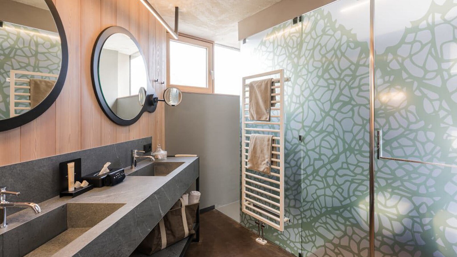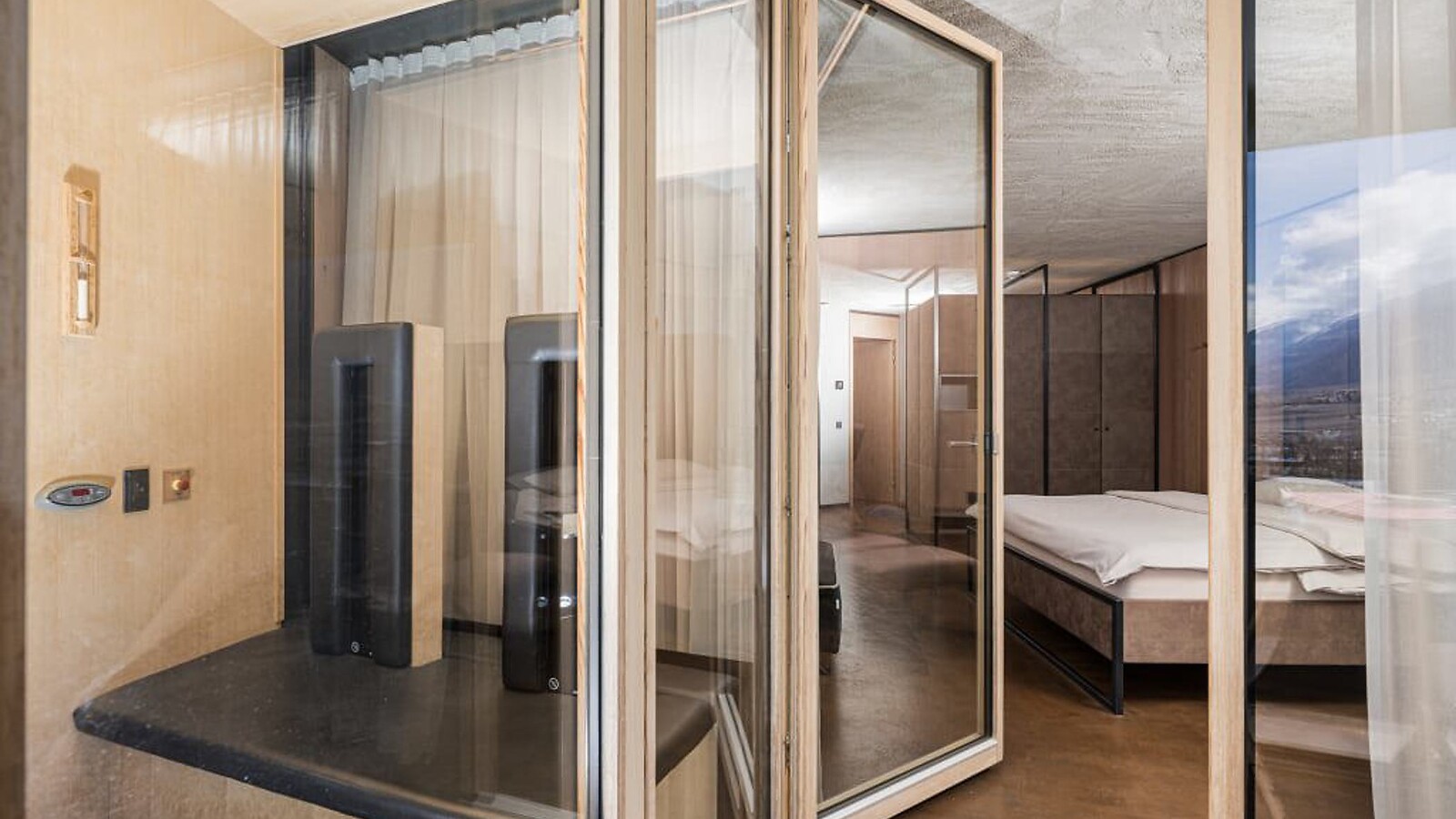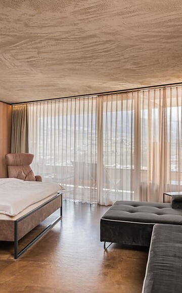 approx. 57 m² incl. 12 m² balcony for 2 - 4 people in the new building, Cosy, modern junior suite, furnishings made of natural materials, natural cement flooring in earth tones, brushed solid local larch wood, rough plaster on the ceiling for pleasant room acoustics, wardrobe and bed made of leather, leather desk, floor lamp with sofa bed (French size) and designer lounge armchairs with side table, flat-screen TV, bathtub with views of the surrounding countryside, bathroom with double sink, shower, toilet and bidet, free Wi-Fi, minibar, safe and garage - pets not allowed
