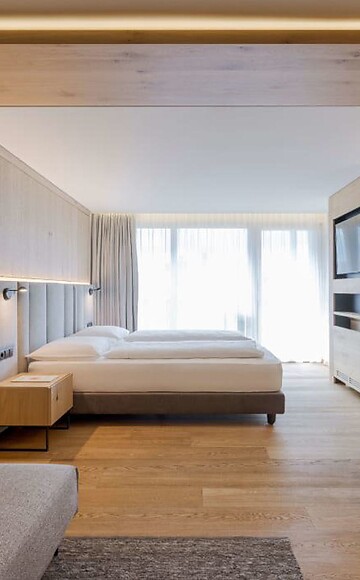 Wake up to playful rays of sunlight. Our Sunshine double room features a comfortable seating corner and armchair, wooden floor, natural wood furniture, modern bathroom with walk-in shower, separate toilet, minibar, safe, flat screen TV, telephone, free WiFi, south-facing balcony with relax lounger, a garage parking space and air conditioning.