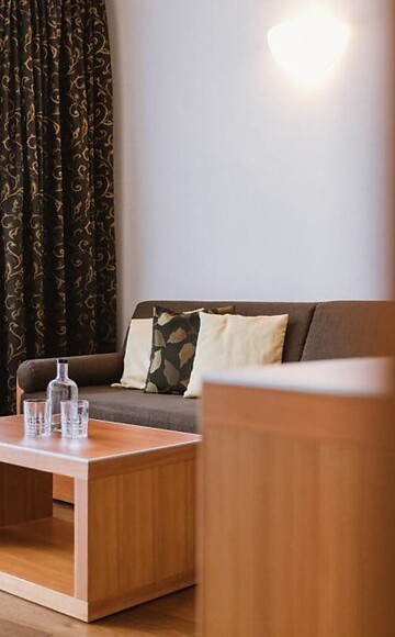 approx. 59 m² incl. 11 m² balcony for 2 - 4 people, Suite on the 3rd and 4th floor, bedroom and living room with door to separate the two areas, couch and seating area, modern furnishings, decorated in warm colours, wood flooring, bathroom with bathtub and shower, bidet, separate toilet, flat-screen TV, free Wi-Fi, minibar, safe, south-facing balcony, parking space in the garage