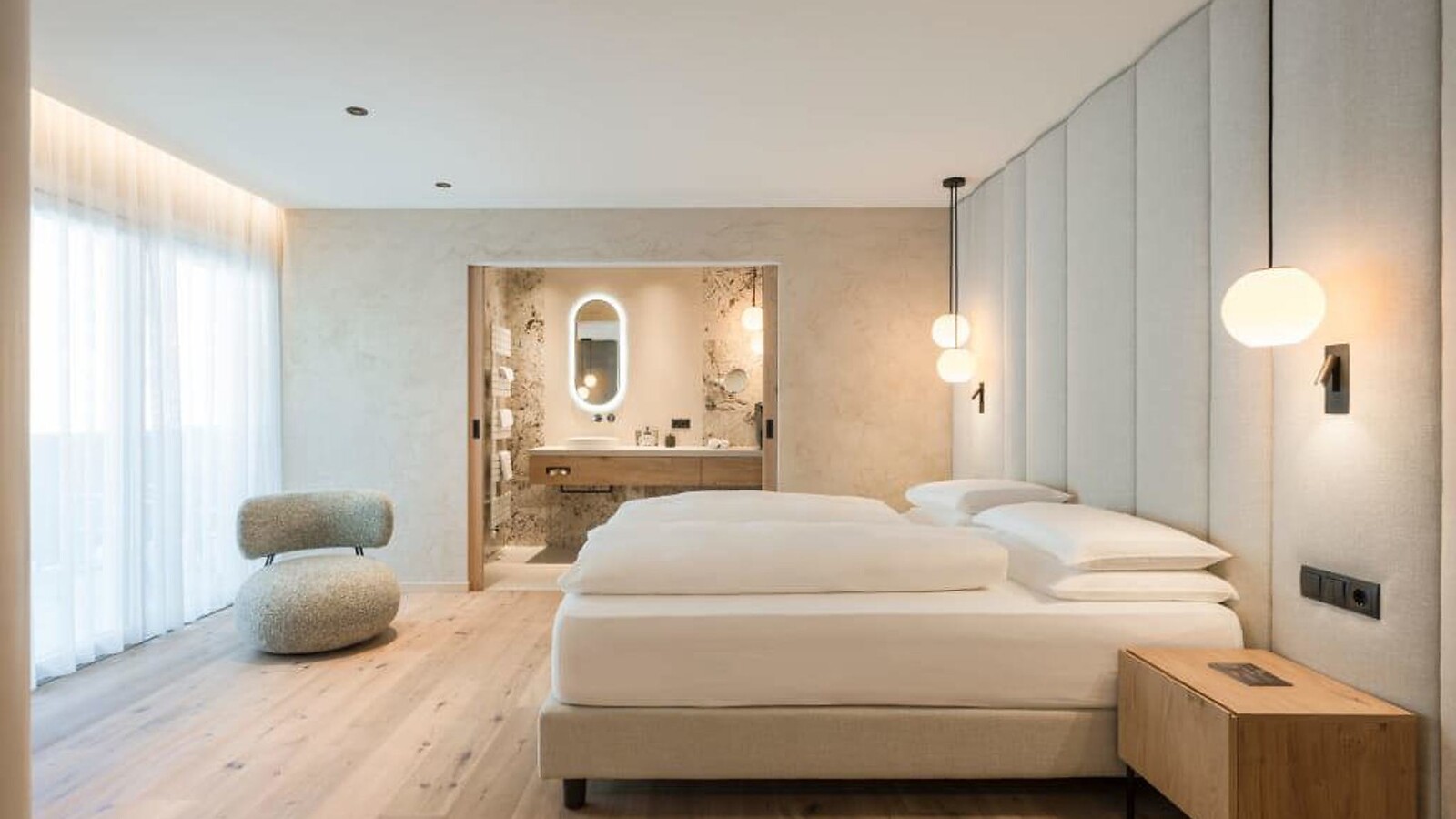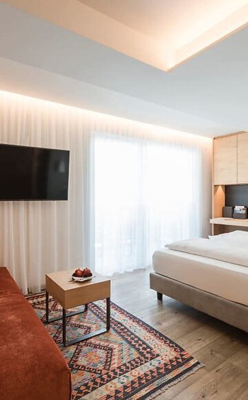 Luminoso e invitante. La nostra camera doppia Prato fiorito è arredata con un accogliente angolo soggiorno, pavimento in legno, mobili in legno naturale, bagno moderno con grande doccia walk-in, WC separato (senza bidet), frigobar, cassaforte, flat screen TV, telefono, WIFI gratuito, balcone rivolto a nord, posto garage e aria condizionata.