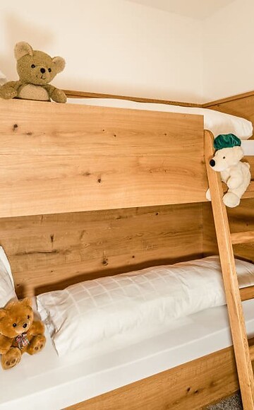40 m² - Family suite with double room and berth with a bunk bed for children and wooden floor. Balcony with afternoon sun. Bathroom with shower, WC, double wash basin, make-up mirror and hairdryer, wellness bag with bathrobe and bathing slippers. Safe, satellite TV, WIFI and minibar as well as a hiking backpack.