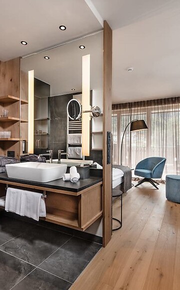 35-40 m² - Luminosa suite con pavimento in legno, balcone panoramico con sole del pomeriggio e vista splendida. Bagno con doccia, in parte con doppio lavabo, specchio cosmetico, asciugacapelli ed in parte con WC separato. Cassaforte, TV sat, WI-FI e minibar.