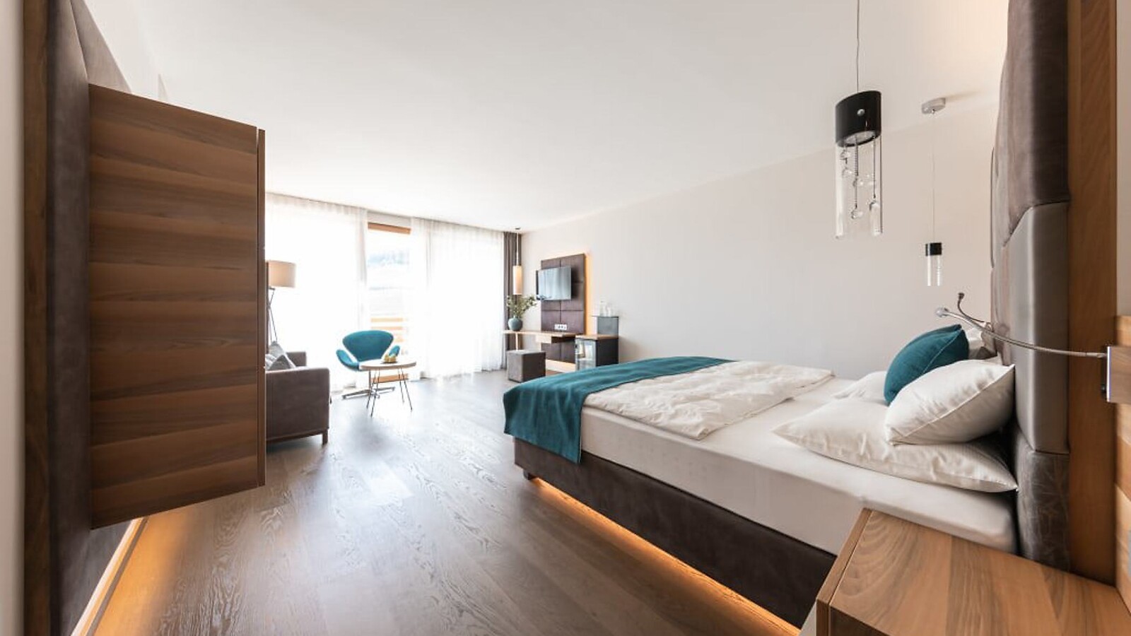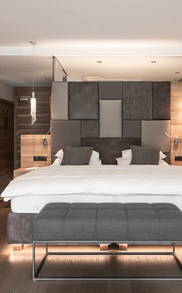 65 m² incluso 8 m² balcone a loggia, nuovo entrée e bagno con doccia lussuosa e wc separato, vista lato sud sul Pool Garden e sul verde circostante, ampio balcone a loggia, tv a schermo piatto, cassetta di sicurezza, minibar con prodotti dell'Alto Adige, lussuoso letto extra large, cameretta separata per 1-2 persone, con aria condizionata, parcheggio privato in garage incluso
