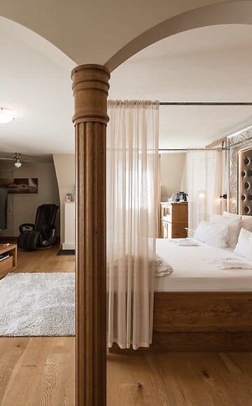 71m² compreso 6m² balcone esposto a est, arredamento classico ed elegante in legno naturale, nobile suite con grande area giorno-notte, letto a baldacchino di lusso "Romantic Dream" con cielo stellato e sistema Sleep-Fit-Health lungo 210 cm, spazioso sistema d'armadio comfort, sauna a raggi infrarossi, poltrona massaggiante relax, scrivania, romantico caminetto, TV Dolby Surround con DVD, small-bar con angolo vino, Nespresso e tè, spazioso bagno di lusso con doccia-relax per 2, vasca idromassaggio romantica con sistema Hygienic Luxury, lavabo pregiato, WC e bidet a parte, comodi mobili relax sul balcone, animali non ammessi. Nel Sonnenschlössl.