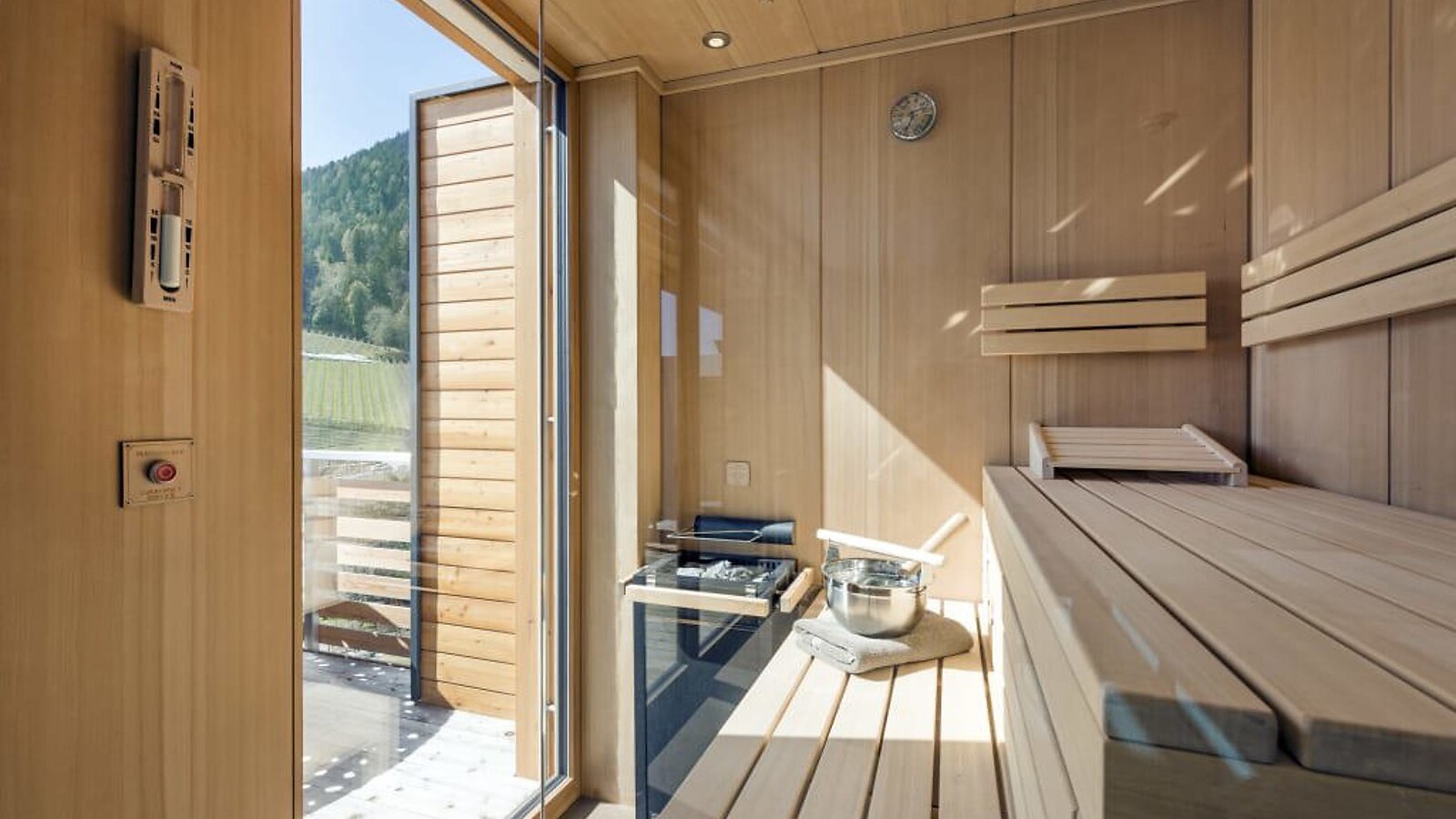 80 m² incluso 20 m² terrazza pergolata, dall'esclusivo design ALPIANA, con pavimento in legno di quercia, sauna finlandese privata, moderno bagno di lusso con doccia, vasca e wc separato, vista mozzafiato sulle montagne e sul verde circostante, al terzo piano, cabina armadio, tv a schermo piatto, cassetta di sicurezza, minibar con prodotti dell'Alto Adige, lussuoso letto extra large, con aria condizionata, ampia terrazza pergolata (20m²) con mobili outdoor e cocoon per momenti romantici, parcheggio in garage incluso