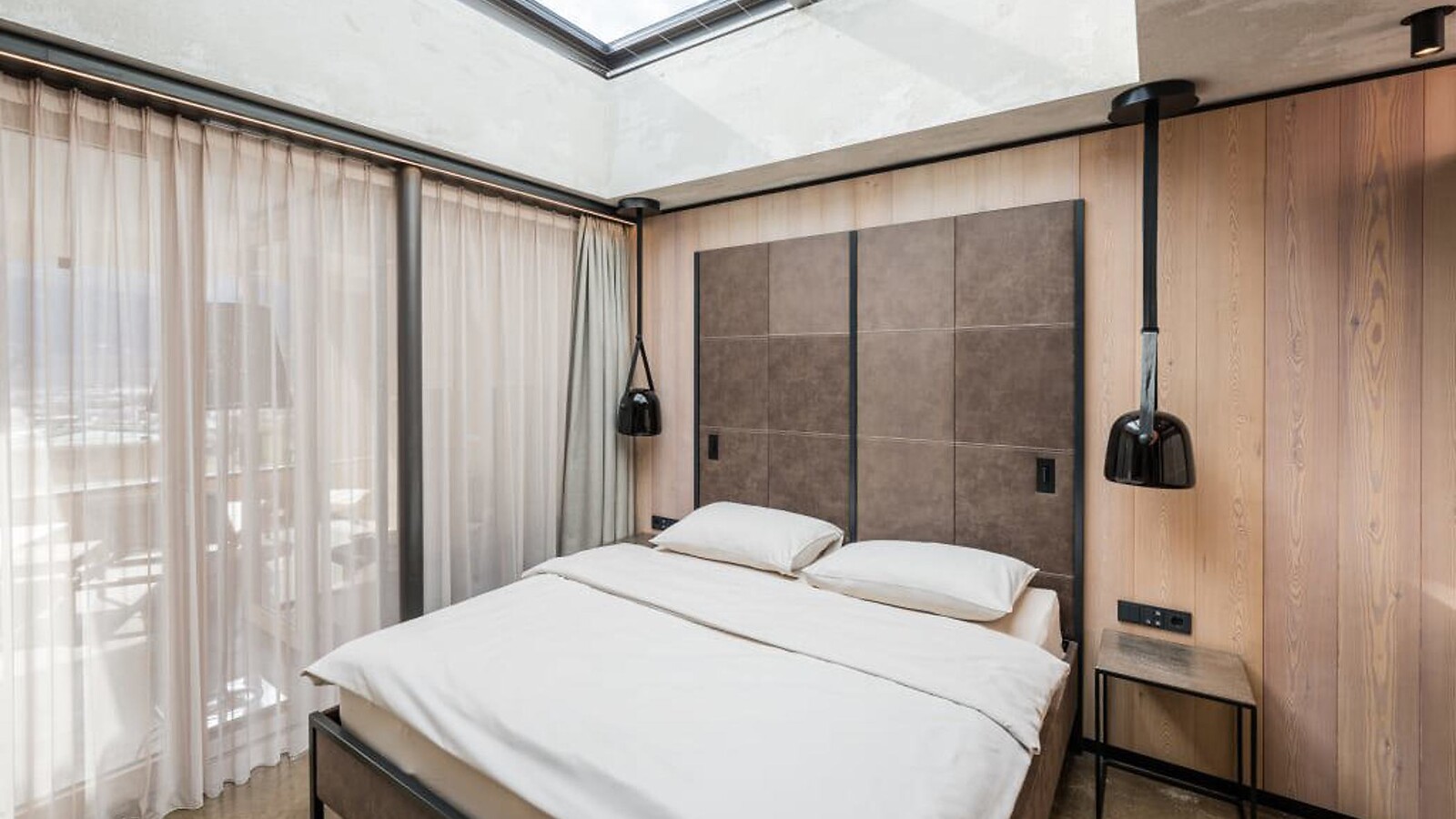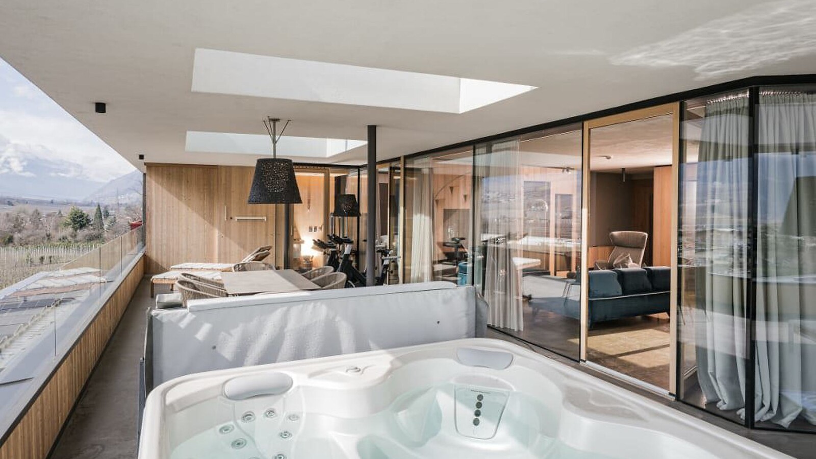 ca. 176 m² incl. 81 m² di terrazza per 4 - 6 persone nella nuova costruzione, Suite di lusso per famiglie accogliente e moderna, con 2 camere da letto e un soggiorno separato, arredamento in materiali naturali, pavimento in cemento naturale color terra, larice massiccio nostrano spazzolato, intonaco grezzo a spruzzo sul soffitto per una piacevole acustica ambientale, armadio e letto in pelle con vista cielo attraverso il soffitto, scrivania in pelle, lampada da terra con divano letto (misura francese) e poltrone di design con tavolino, cucinino (bollitore, angolo caffè, piano cottura, cocktail bar, grande tavolo da pranzo), caminetto, TV a schermo piatto, cinema privato, 2 bagni separati con vasca freestanding di design, bagno con doppio lavabo, doccia, WC con bidet, Wi-Fi gratuito, minibar, cassaforte e posto macchina in garage - animali domestici non ammessi