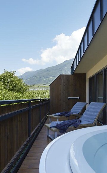 53 m² - Lussuosa suite con camera matrimoniale e camera a due letti separata, pavimento in legno e balcone con sole del mattino e jacuzzi privato (NUOVO). Bagno con vasca e doccia, WC, doppio lavabo, bidet, specchio cosmetico e asciugacapelli. Cassaforte, TV sat, WI-FI e minibar.