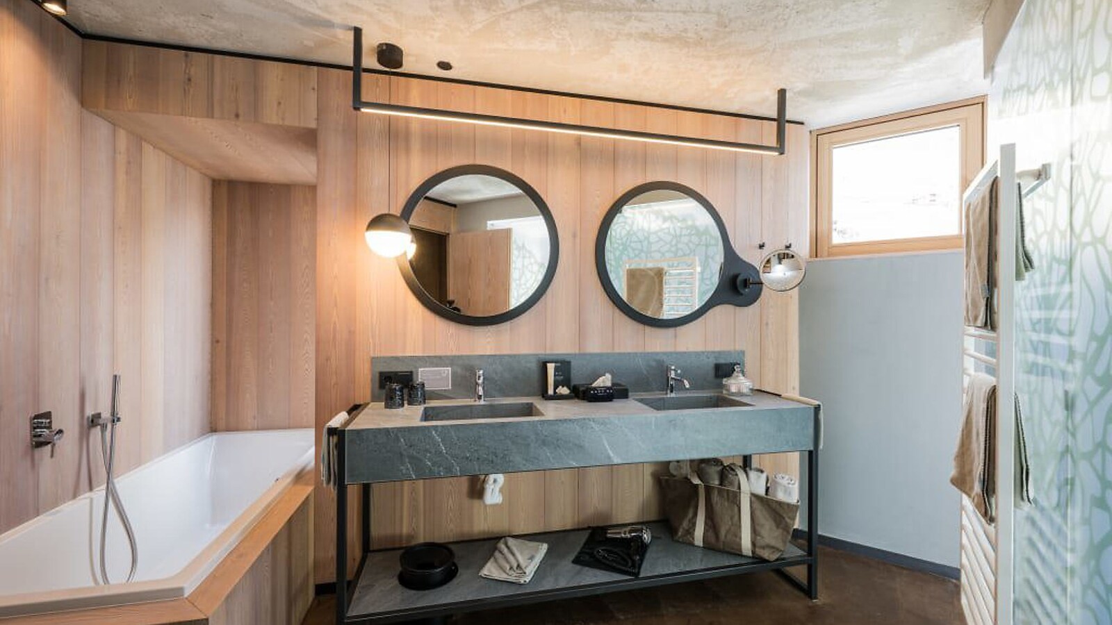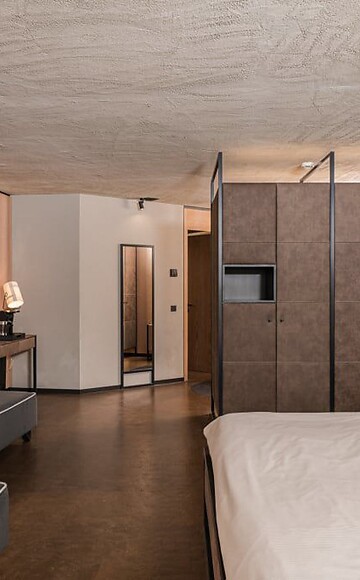 ca. 57 m² incl. 12 m² di balcone per 2 - 4 persone nella nuova costruzione, Junior suite accogliente e moderna, arredamento in materiali naturali, pavimento in cemento naturale color terra, larice massiccio nostrano spazzolato, intonaco grezzo a spruzzo sul soffitto per una piacevole acustica ambientale, armadio e letto in pelle, scrivania in pelle, lampada da terra con divano letto (misura francese) e poltrone di design con tavolino, TV a schermo piatto, vasca da bagno con vista sulla natura, bagno con doppio lavabo, doccia, WC con bidet, Wi-Fi gratuito, minibar, cassaforte e posto macchina in garage - animali domestici non ammessi