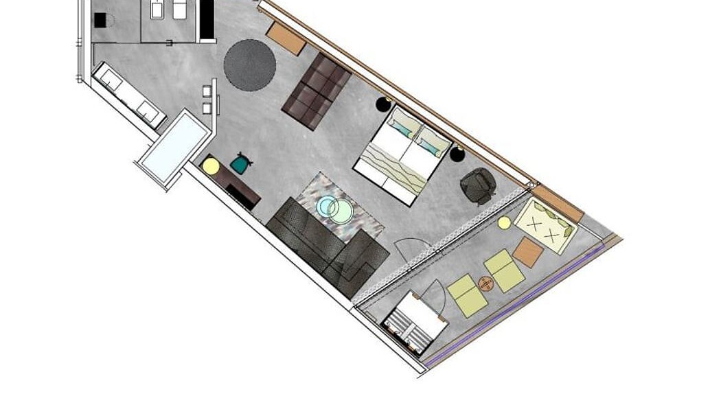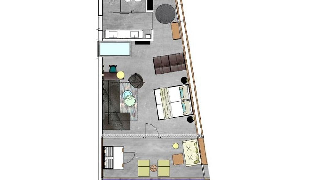 Arredi di design sul balcone: 2 lettini, un tavolino, una sedia e una sedia a dondolo