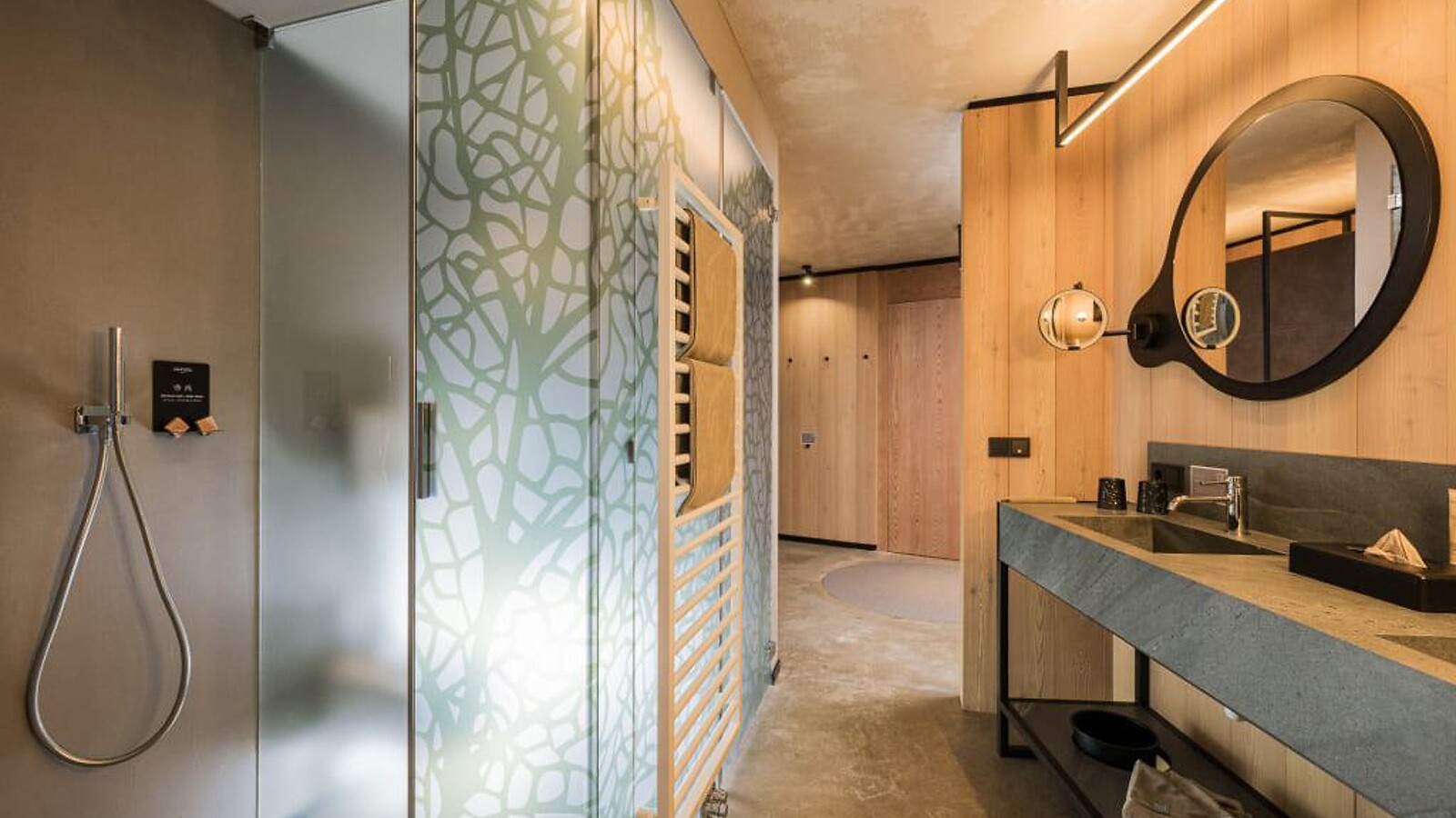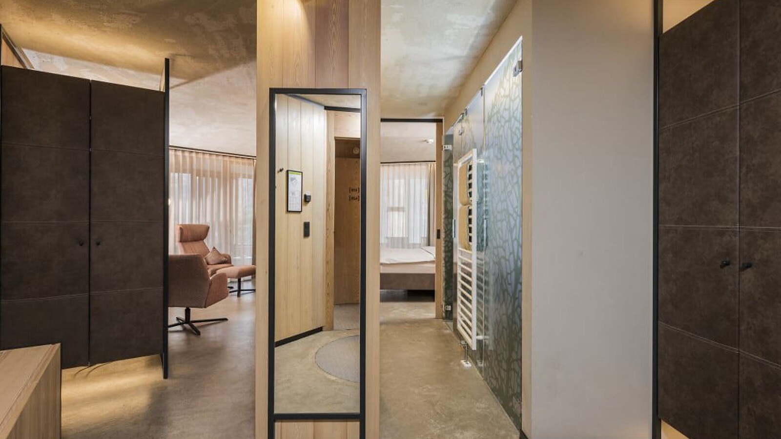 ca. 68 m² incl. 23 m² di balcone per 2 - 4 persone nella nuova costruzione, Suite accogliente e moderna, zona giorno e zona notte separate, arredamento in materiali naturali, pavimento in cemento naturale color terra, larice massiccio nostrano spazzolato, intonaco grezzo a spruzzo sul soffitto per una piacevole acustica ambientale, armadio e letto in pelle, divano letto (misura francese), scrivania in pelle, lampada da terra con poltrone di design, bagno con doppio lavabo, doccia, WC con bidet, TV a schermo piatto, Wi-Fi gratuito, minibar, cassaforte, posto macchina in garage - animali domestici non ammessi