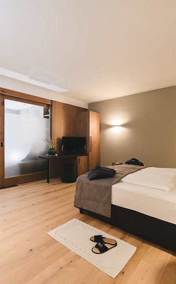 Ampia suite con zona giorno e notte separati con porta di vetro. Pavimento in legno e balcone con sole del mattino. Bagno con doccia, WC separato, doppio lavabo, specchio cosmetico e asciugacapelli, borsa wellness con accappatoio e ciabatte. Cassaforte, TV sat, WI-FI e minibar. Zaino escursionistico.